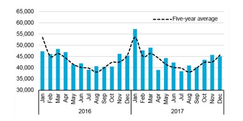 To give the figures some colour, the following chart shows how monthly death numbers in 2017 compared to 2016 as well as to the preceding 5 year average. The chart shows how the total reached in 2017 wasn't the result of an exceptional month – monthly deaths in 2017 exceeded the 5 year average nearly every month.
